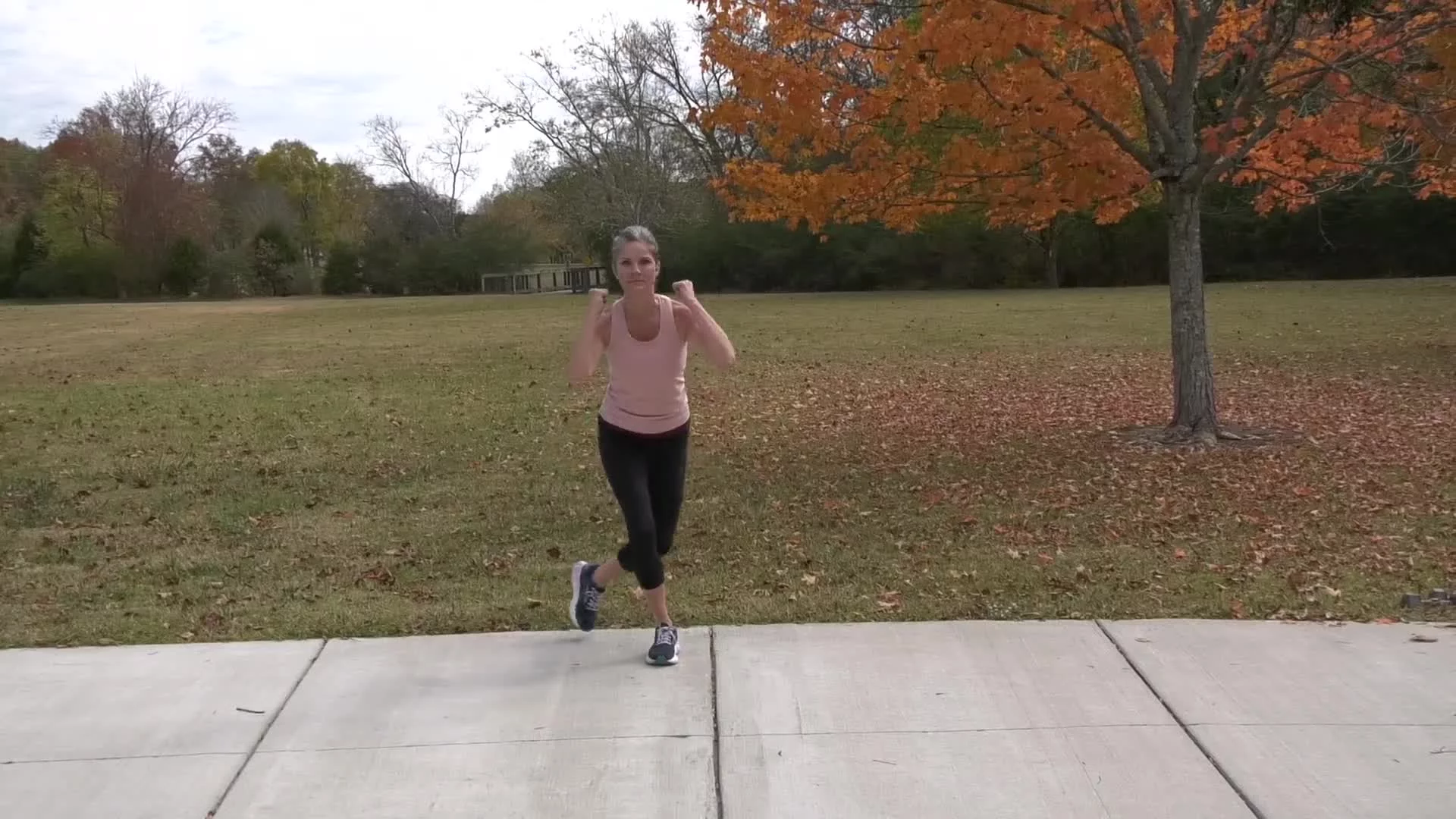 In kneeling position, extend one leg forward, with knee bent at 90 degree angle, and foot planted on ground for support, dumbbells in each hand. This is starting position. Complete a bicep curl with palms facing each other, then raise hands towards sky in an overhead press. Return to starting position for one rep.